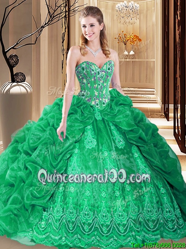 Neckline : SweetheartShown Color : GreenSilhouette : Ball GownsSleeve Length : sleevelessBack Detail : Lace upFabric : OrganzaEmbellishment : Embroidery,Pick UpsOccasion : Prom,Military Ball,Sweet 16,QuinceaneraSeason : Spring,Summer,Fall,Winter