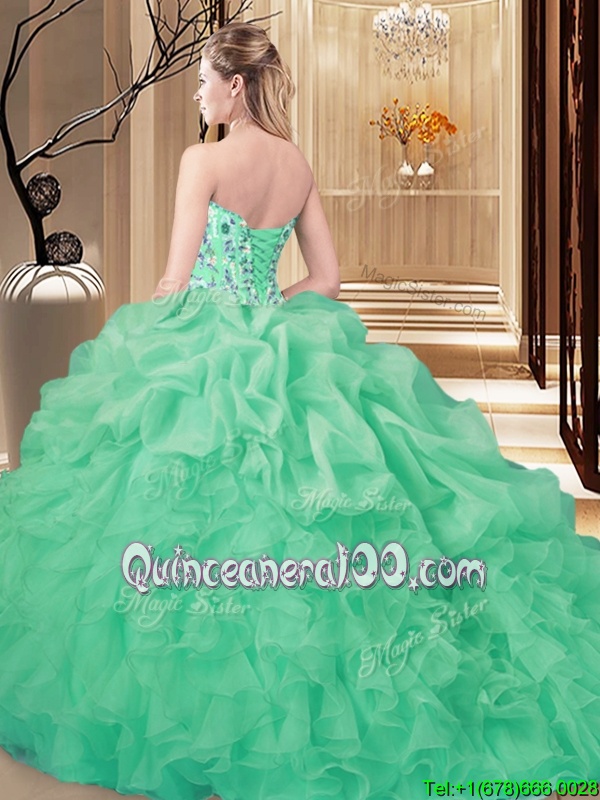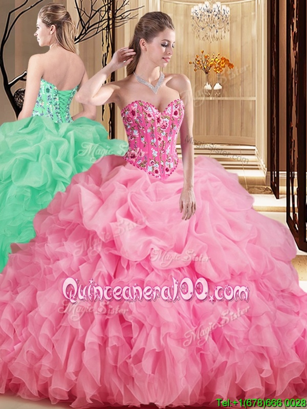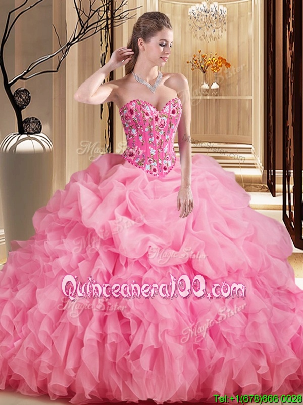 Neckline : SweetheartShown Color : Rose Pink Silhouette : Ball GownsSleeve Length : sleevelessBack Detail : Lace upFabric : OrganzaEmbellishment : Embroidery,Ruffles,Pick UpsOccasion : Prom,Military Ball,Sweet 16,QuinceaneraSeason : Spring,Summer,Fall,Winter