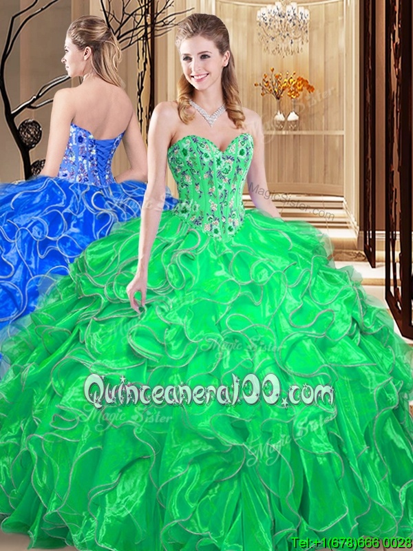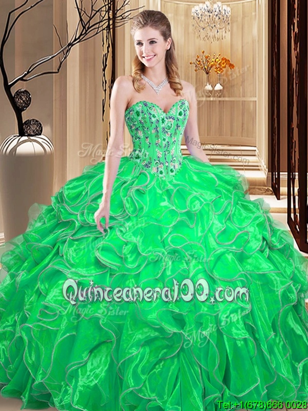 Neckline : SweetheartShown Color : Spring GreenSilhouette : Ball GownsSleeve Length : sleevelessHemline : floor lengthBack Detail : Lace upFabric : OrganzaEmbellishment : Embroidery,RufflesOccasion : Military Ball,Sweet 16,QuinceaneraSeason : Spring,Summer,Fall,Winter