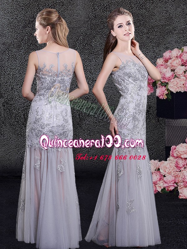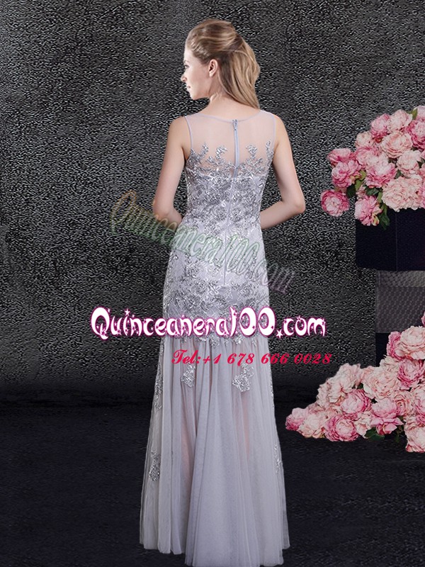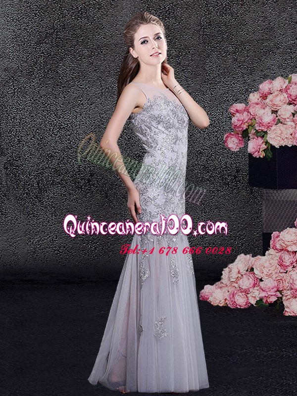 Neckline : ScoopShown Color : GreySilhouette : Column/SheathSleeve Length : sleevelessHemline : floor lengthBack Detail : ZipperFabric : TulleEmbellishment : Lace,AppliquesOccasion : Prom,Military Ball,Wedding PartySeason : Spring,Summer,Fall,Winter