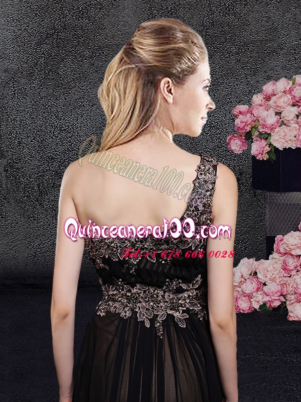 Neckline : One shoulderShown Color : BlackSilhouette : EmpireSleeve Length : sleevelessHemline : floor lengthBack Detail : Side zipperFabric : TulleEmbellishment : AppliquesOccasion : Prom,Party,Military Ball,Wedding PartySeason : Spring,Summer,Fall,Winter