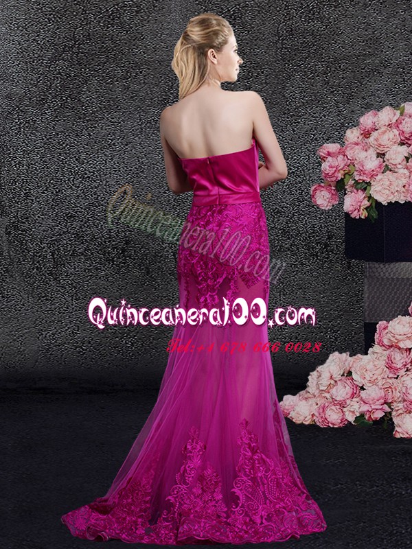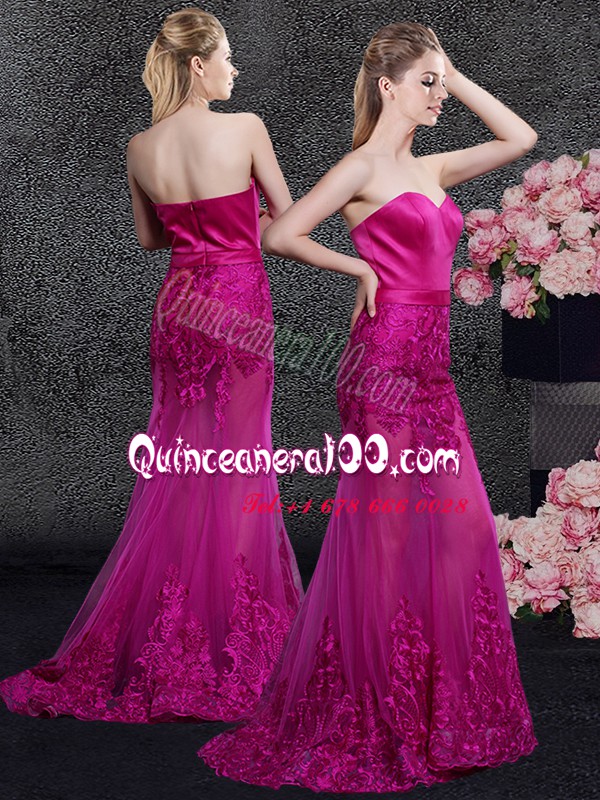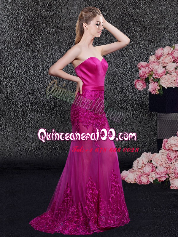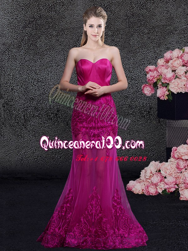 Neckline : SweetheartShown Color : FuchsiaSilhouette : MermaidSleeve Length : sleevelessHemline : floor lengthBack Detail : ZipperFabric : Satin,TulleEmbellishment : Lace,AppliquesOccasion : Prom,Military Ball,Wedding Party