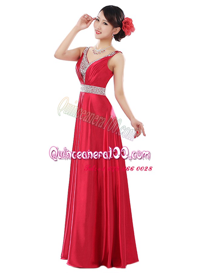 Neckline : V-neckShown Color : Coral RedSilhouette : EmpireSleeve Length : sleevelessHemline : floor lengthBack Detail : ZipperFabric : Elastic Woven SatinEmbellishment : BeadingOccasion : Prom,PartySeason : Spring,Summer,Fall,Winter