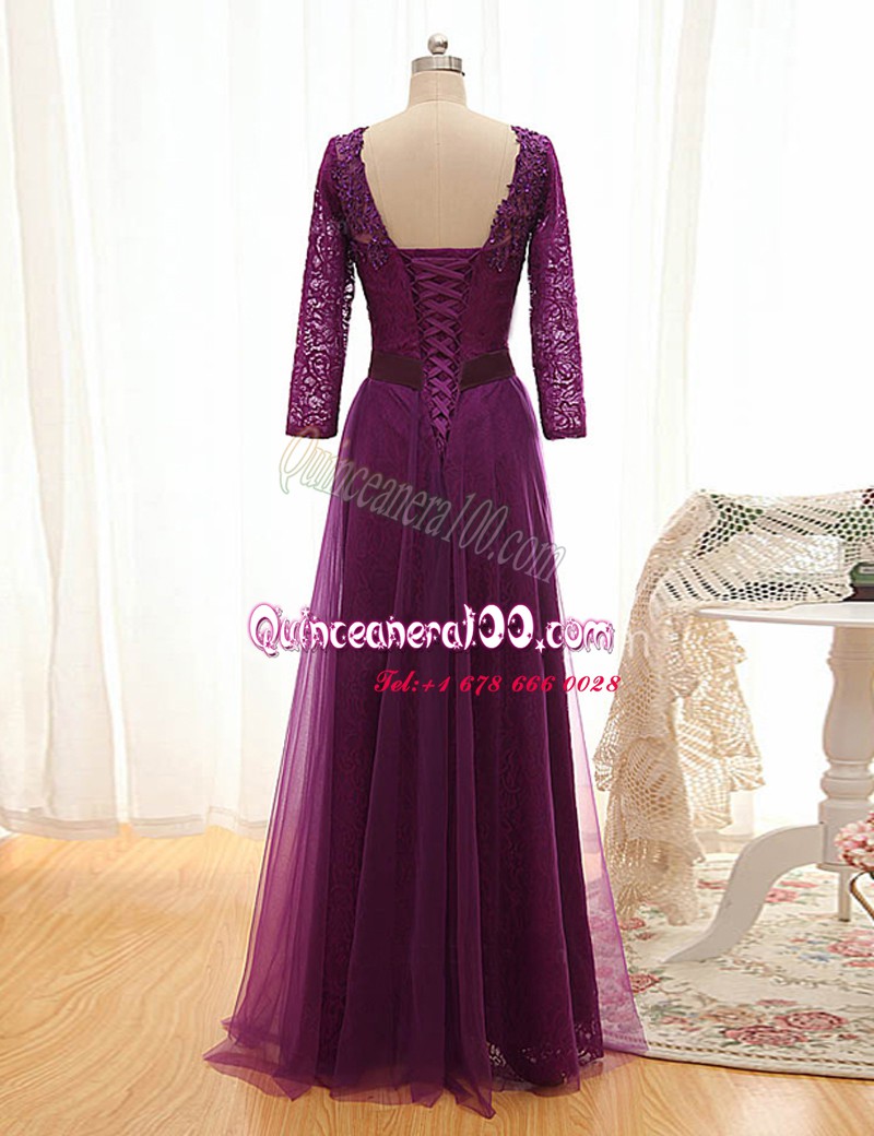 Neckline : V-neckShown Color : PurpleSilhouette : EmpireSleeve Length : 3|4 length sleeveHemline : floor lengthBack Detail : Lace upFabric : TulleEmbellishment : Beading,LaceOccasion : Prom,PartySeason : Spring,Summer,Fall,Winter