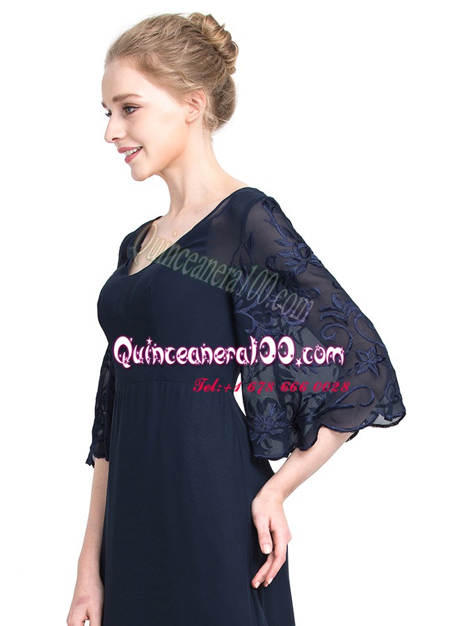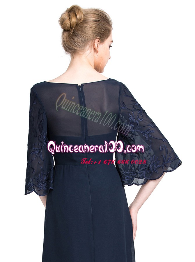 Neckline : V-neckShown Color : Navy BlueSilhouette : EmpireSleeve Length : half sleevesHemline : floor lengthBack Detail : ZipperFabric : ChiffonEmbellishment : AppliquesOccasion : Prom,PartySeason : Spring,Summer,Fall,Winter