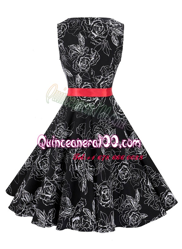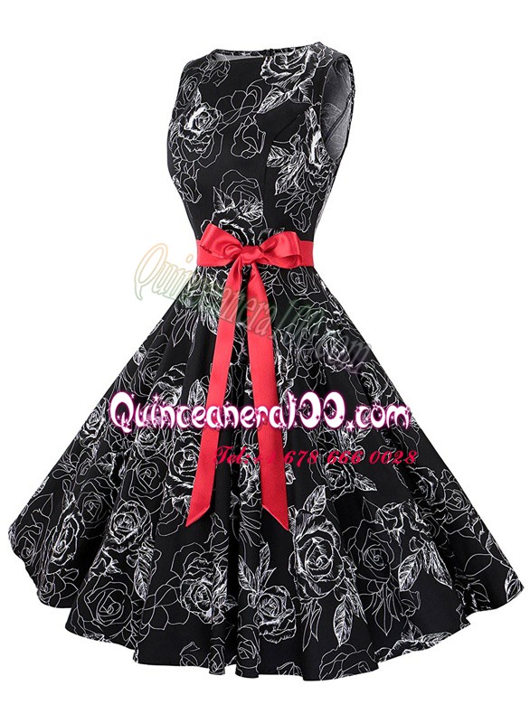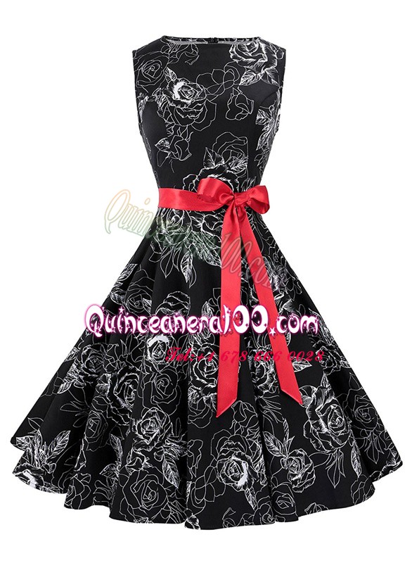 Neckline : ScoopShown Color : BlackSilhouette : A-lineSleeve Length : sleevelessHemline : knee lengthBack Detail : ZipperFabric : ChiffonEmbellishment : Sashes|ribbons,PatternOccasion : Prom,PartySeason : Spring,Summer,Fall,Winter