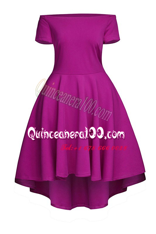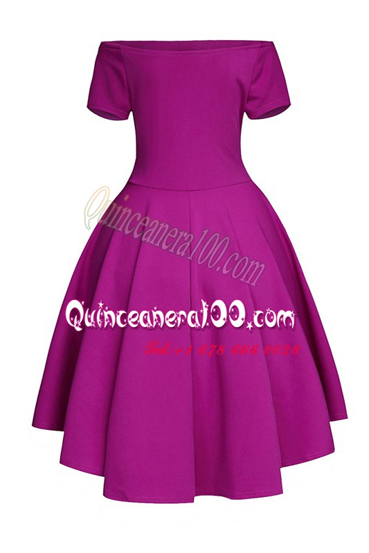Neckline : BateauShown Color : FuchsiaSilhouette : A-lineSleeve Length : short sleevesHemline : tea lengthBack Detail : Side zipperFabric : SatinEmbellishment : RuchingOccasion : Prom,PartySeason : Spring,Summer,Fall,Winter