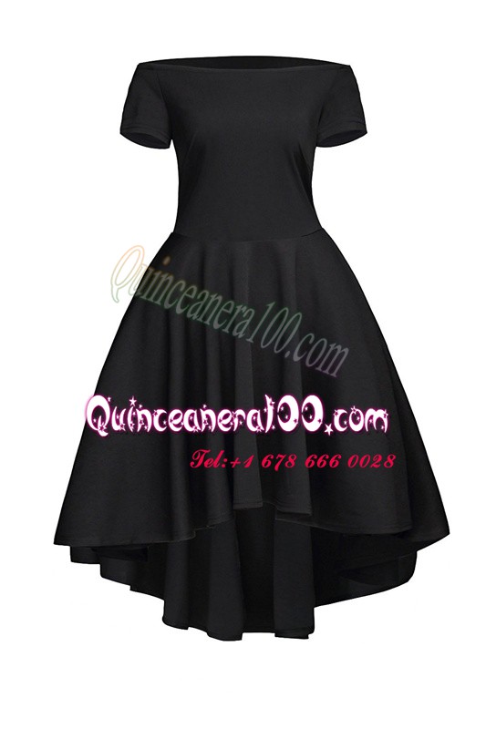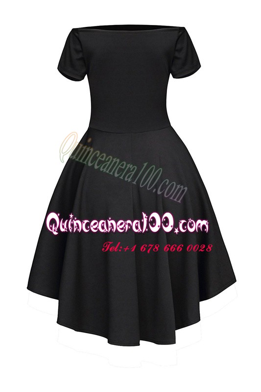 Neckline : BateauShown Color : BlackSilhouette : A-lineSleeve Length : short sleevesHemline : tea lengthBack Detail : Side zipperFabric : SatinEmbellishment : RuchingOccasion : Prom,PartySeason : Spring,Summer,Fall,Winter