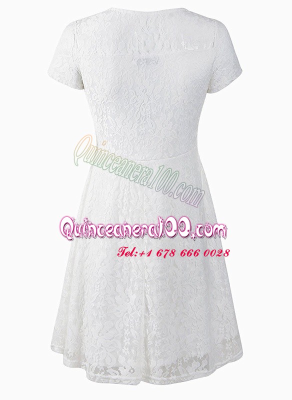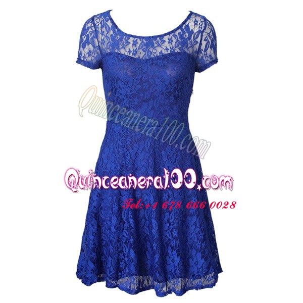 Neckline : ScoopShown Color : BlueSilhouette : EmpireSleeve Length : short sleevesHemline : tea lengthBack Detail : Side zipperFabric : OrganzaEmbellishment : LaceOccasion : Prom,PartySeason : Spring,Winter