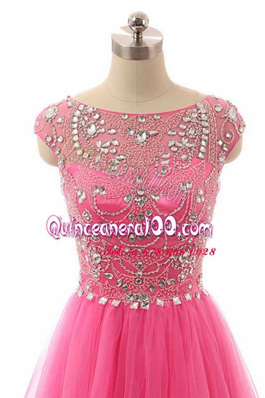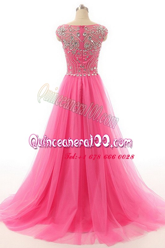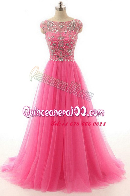 Neckline : BateauShown Color : Hot PinkSilhouette : A-lineSleeve Length : short sleevesHemline : floor lengthBack Detail : ZipperFabric : LaceEmbellishment : BeadingOccasion : Prom,PartySeason : Spring,Summer,Fall,Winter