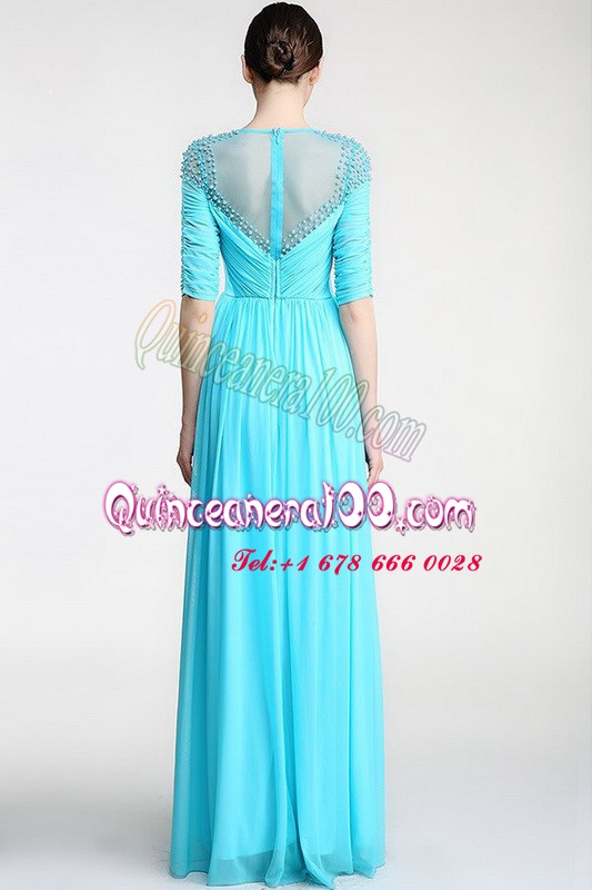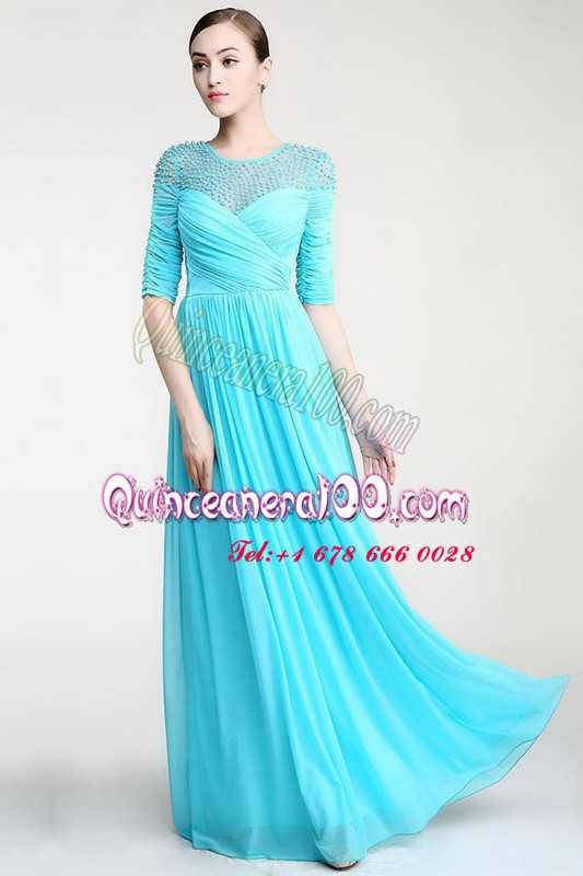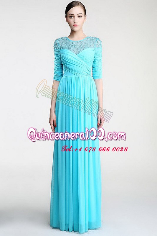 Neckline : ScoopShown Color : Aqua BlueSilhouette : Column/SheathSleeve Length : sleevelessHemline : floor lengthBack Detail : ZipperFabric : ChiffonEmbellishment : Beading,RuchingOccasion : Prom,PartySeason : Spring,Summer,Fall,Winter
