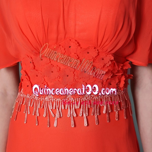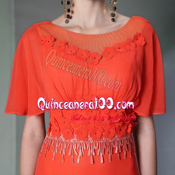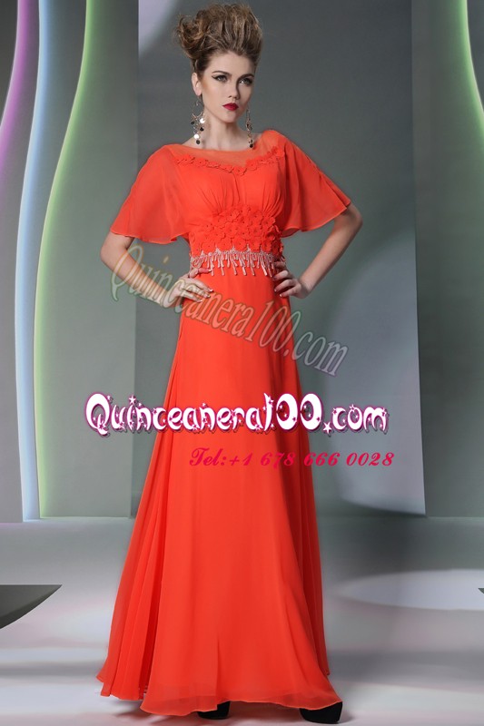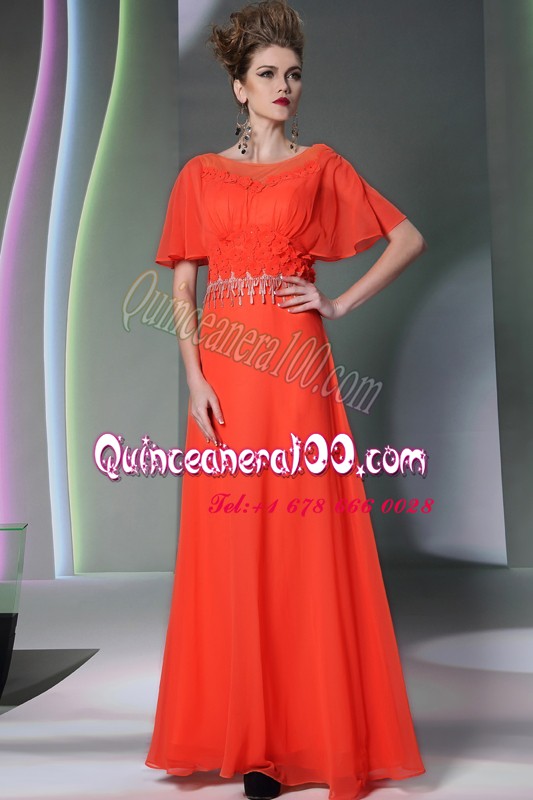 Neckline : ScoopShown Color : Coral RedSilhouette : Column/SheathSleeve Length : short sleevesHemline : ankle lengthBack Detail : Side zipperFabric : ChiffonEmbellishment : AppliquesOccasion : Prom,PartySeason : Spring,Summer,Fall,Winter