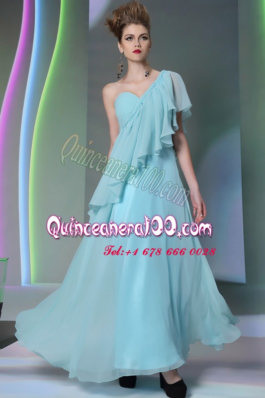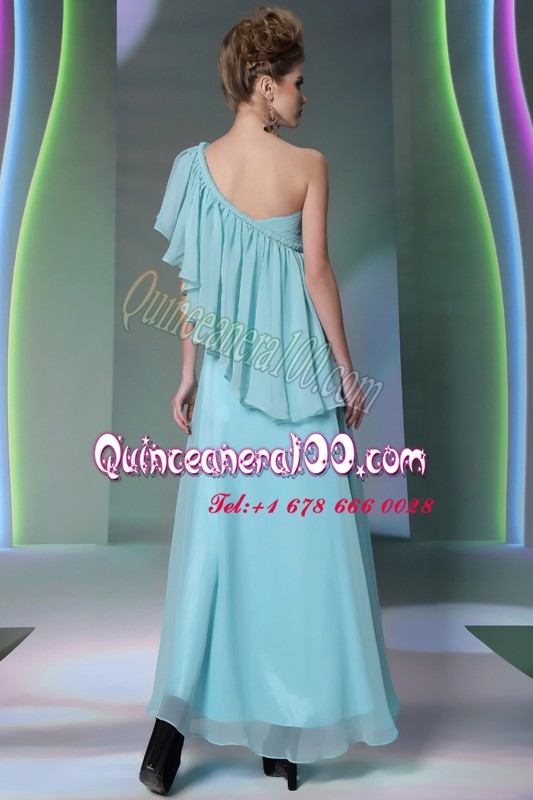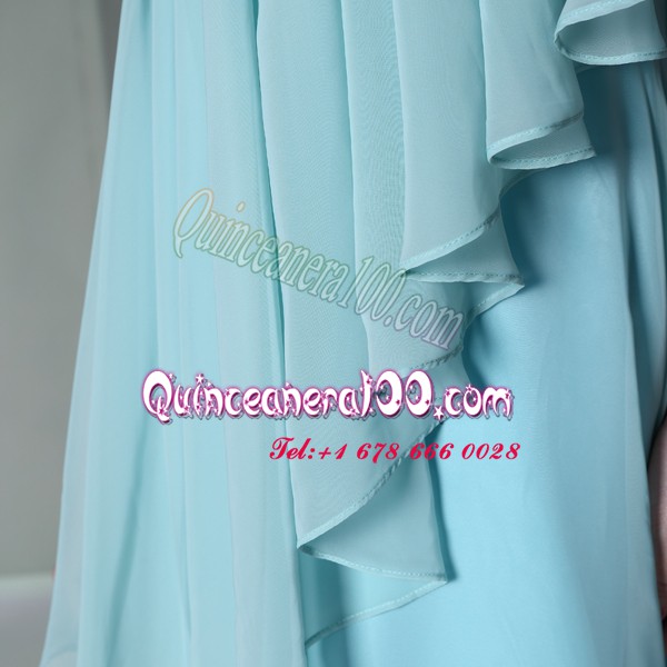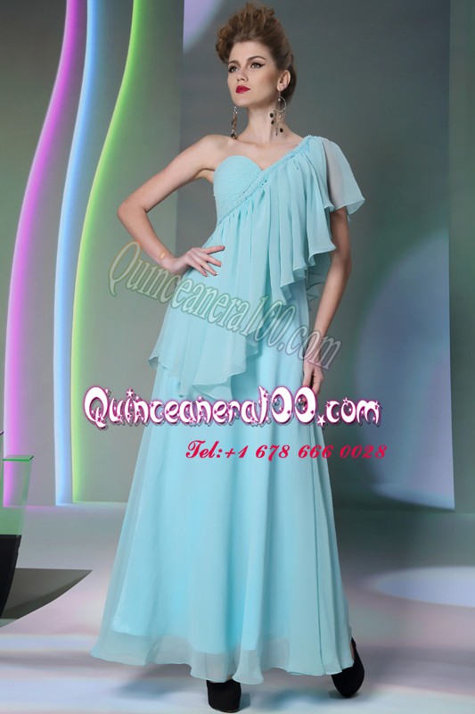 Neckline : One shoulderShown Color : Light BlueSilhouette : Column/SheathSleeve Length : cap sleevesHemline : ankle lengthBack Detail : Side zipperFabric : ChiffonEmbellishment : RufflesOccasion : Prom,PartySeason : Spring,Summer,Fall,Winter