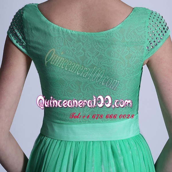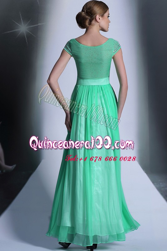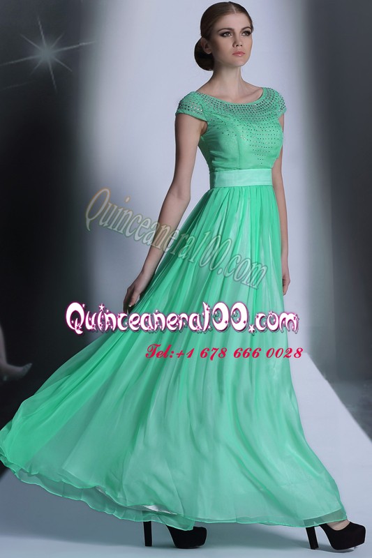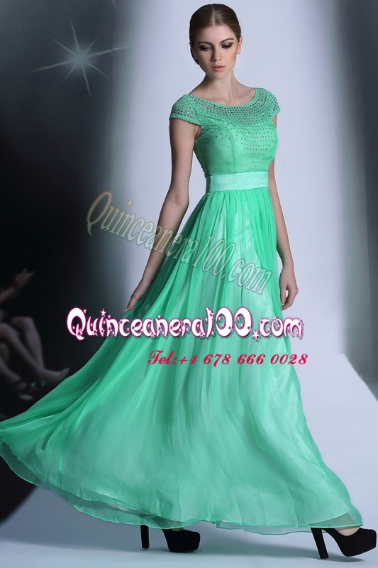 Neckline : ScoopShown Color : TurquoiseSilhouette : EmpireSleeve Length : cap sleevesHemline : floor lengthBack Detail : Side zipperFabric : ChiffonEmbellishment : BeadingOccasion : Prom,PartySeason : Spring,Summer,Fall,Winter