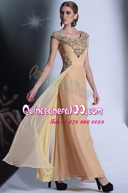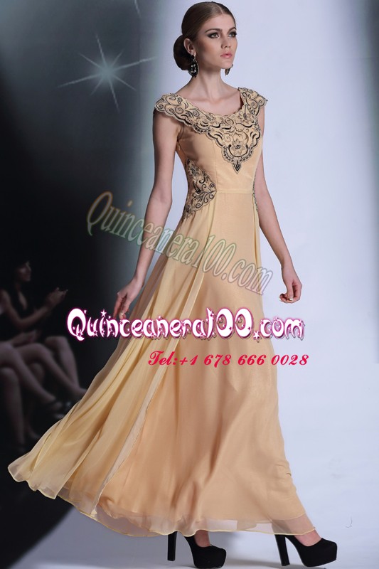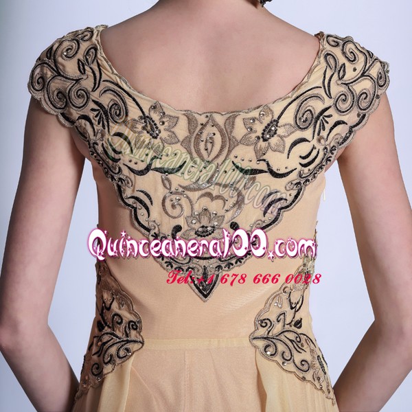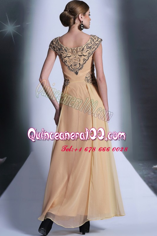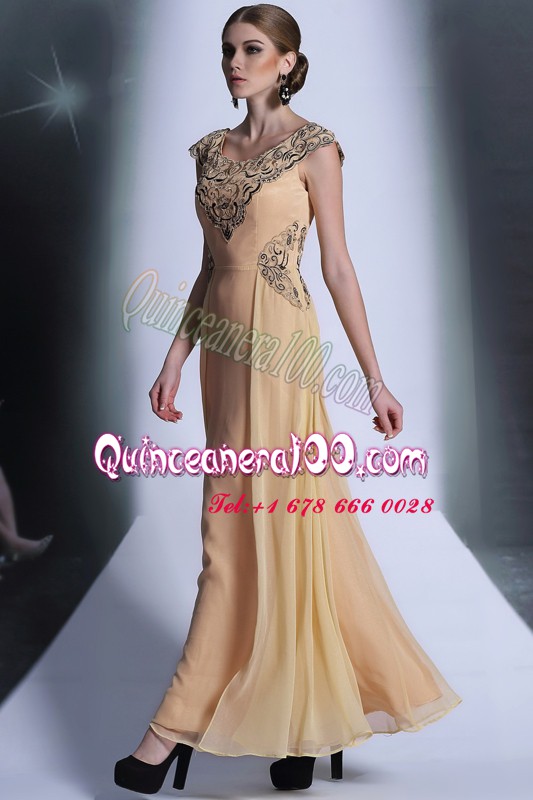 Neckline : ScoopShown Color : PeachSilhouette : EmpireSleeve Length : cap sleevesHemline : floor lengthBack Detail : Side zipperFabric : ChiffonEmbellishment : Beading,AppliquesOccasion : Prom,PartySeason : Spring,Summer,Fall,Winter