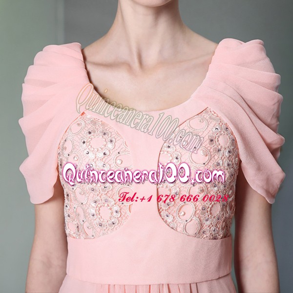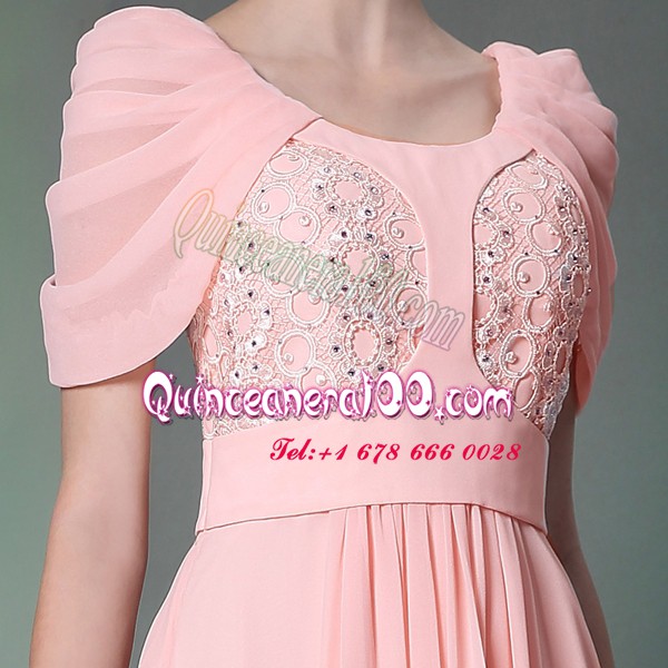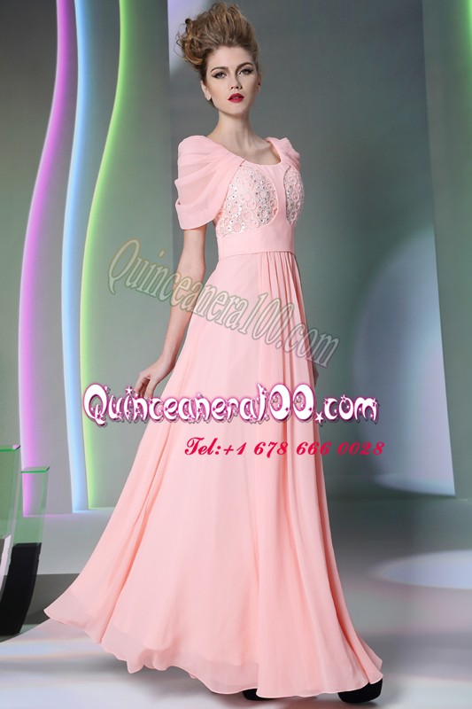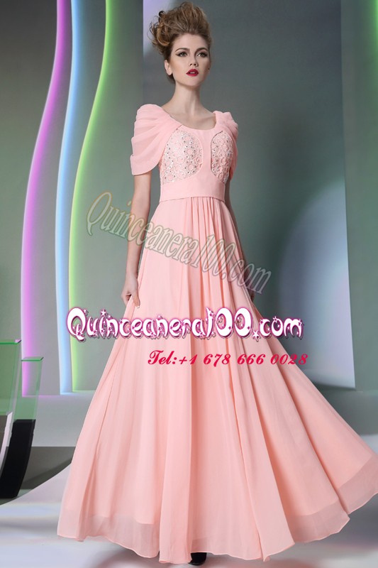 Neckline : ScoopShown Color : Baby PinkSilhouette : EmpireSleeve Length : cap sleevesHemline : floor lengthBack Detail : Side zipperFabric : ChiffonEmbellishment : BeadingOccasion : Prom,PartySeason : Spring,Summer,Fall,Winter