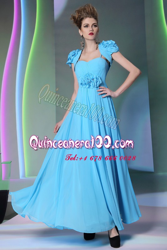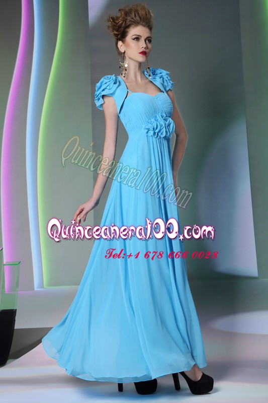 Neckline : SweetheartShown Color : Baby BlueSilhouette : EmpireSleeve Length : cap sleevesHemline : floor lengthBack Detail : ZipperFabric : ChiffonEmbellishment : Beading,Hand Made FlowerOccasion : Prom,PartySeason : Spring,Summer,Fall,Winter