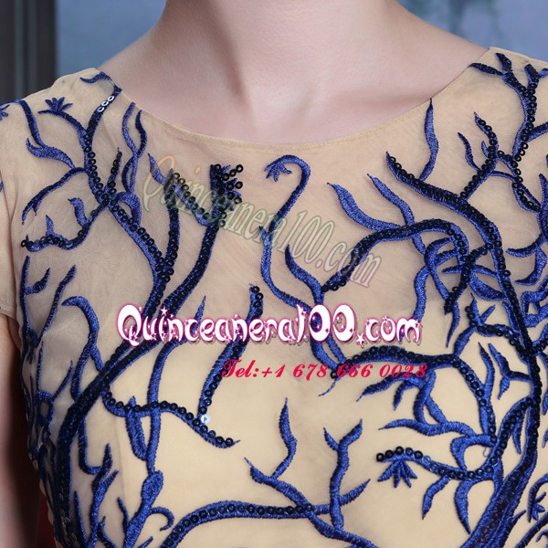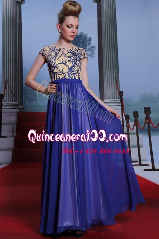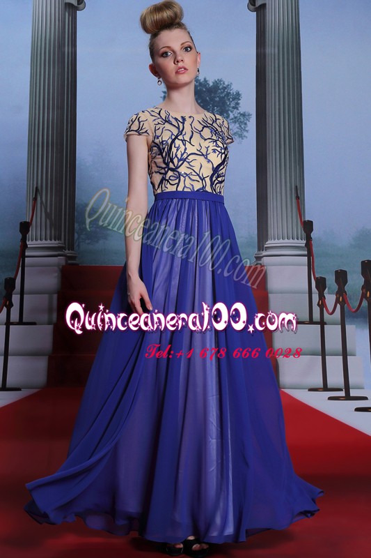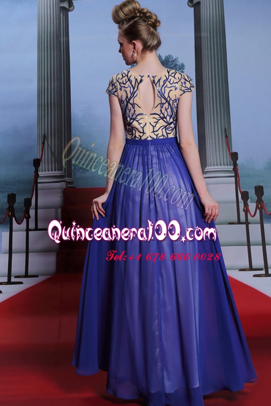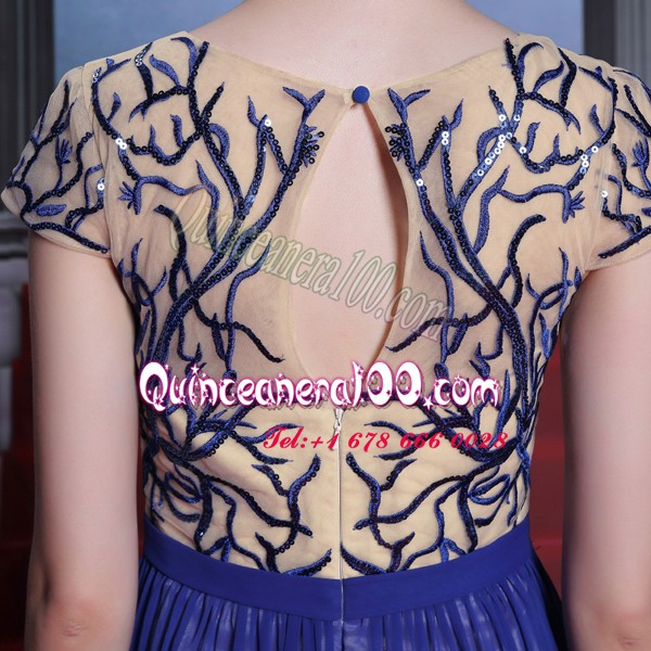Neckline : ScoopShown Color : Royal BlueSilhouette : Column/SheathSleeve Length : cap sleevesHemline : floor lengthBack Detail : ZipperFabric : ChiffonEmbellishment : Embroidery,SequinsOccasion : Prom,PartySeason : Spring,Summer,Fall,Winter