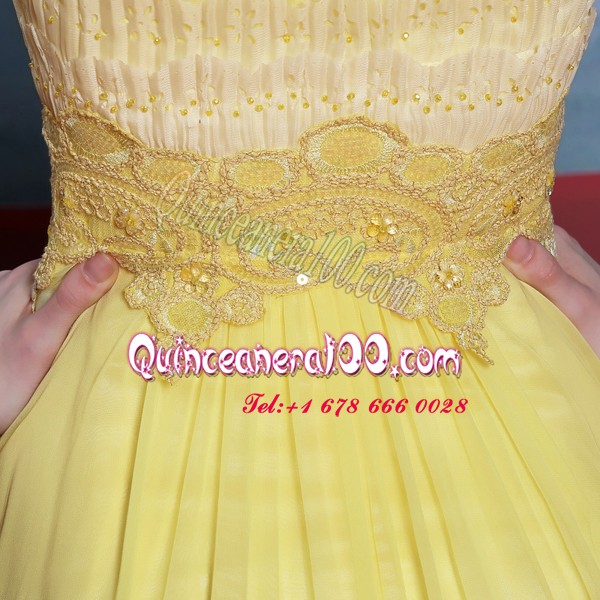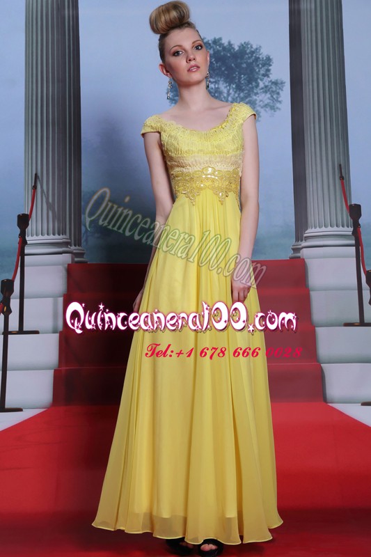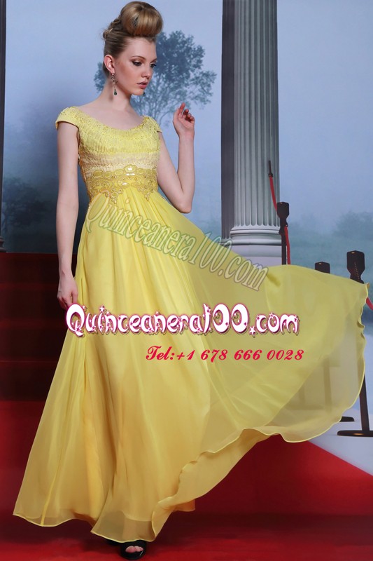 Neckline : ScallopedShown Color : YellowSilhouette : Ball GownsSleeve Length : short sleevesHemline : floor lengthBack Detail : Side zipperFabric : ChiffonEmbellishment : Beading,Appliques,PleatedOccasion : Prom,PartySeason : Spring,Summer,Fall,Winter