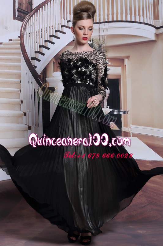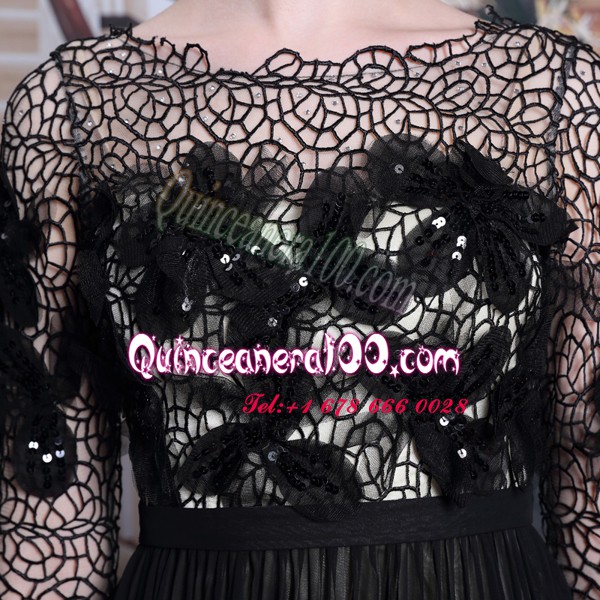 Neckline : AsymmetricShown Color : BlackSilhouette : Column/SheathSleeve Length : 3|4 length sleeveHemline : asymmetricalBack Detail : Clasp handleFabric : ChiffonEmbellishment : Appliques,SequinsOccasion : Prom,PartySeason : Spring,Summer,Fall,Winter