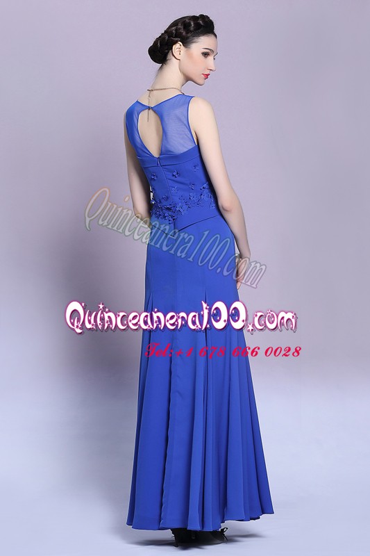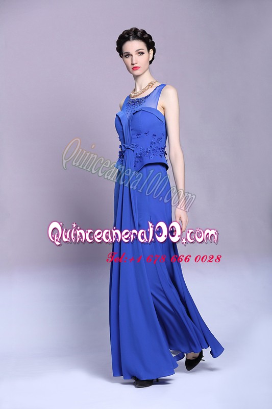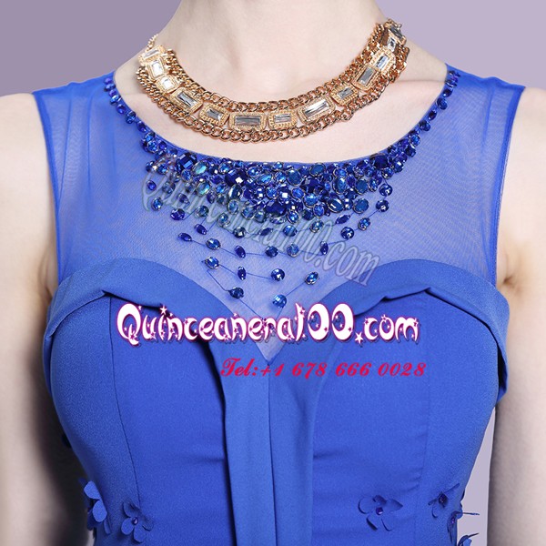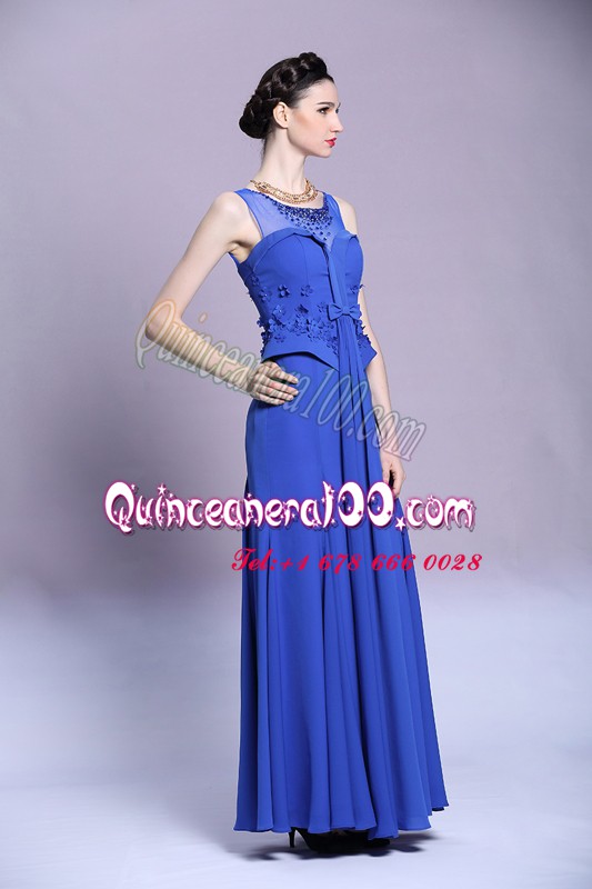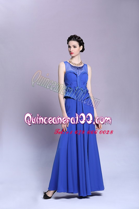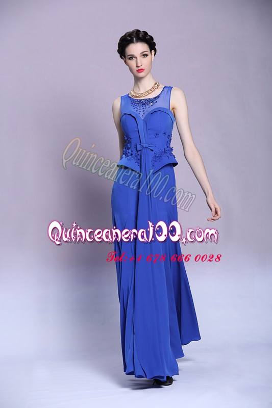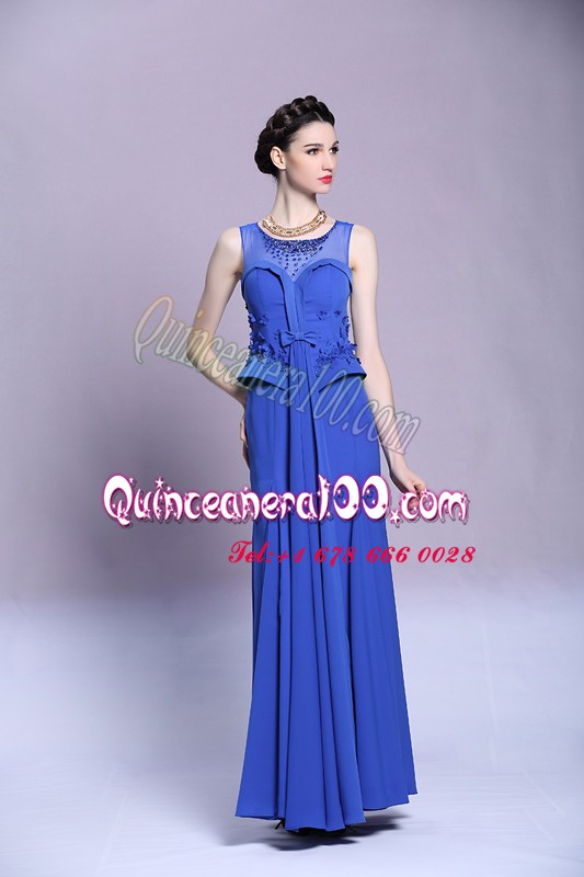 Neckline : ScoopShown Color : BlueSilhouette : Column/SheathSleeve Length : sleevelessHemline : floor lengthBack Detail : ZipperFabric : ChiffonEmbellishment : Beading,AppliquesOccasion : Prom,PartySeason : Spring,Summer,Fall,Winter