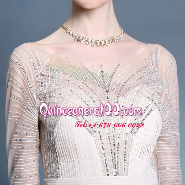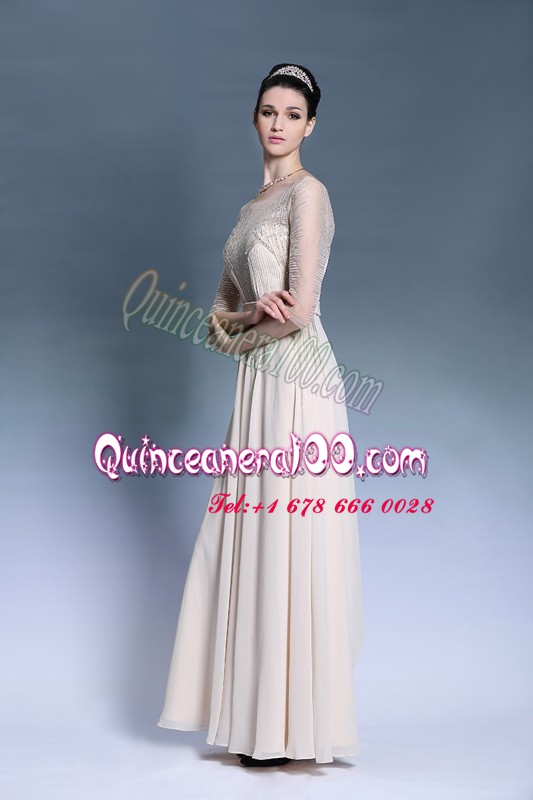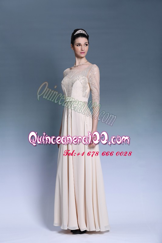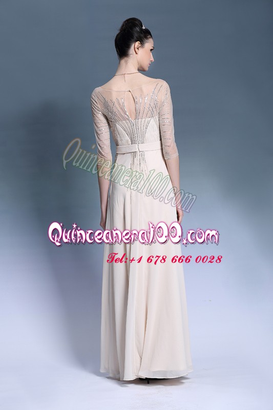 Neckline : BateauShown Color : ChampagneSilhouette : Column/SheathSleeve Length : short sleevesHemline : floor lengthBack Detail : ZipperFabric : ChiffonEmbellishment : Beading,PleatedOccasion : Prom,PartySeason : Spring,Summer,Fall,Winter