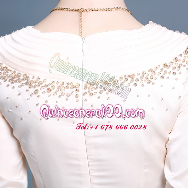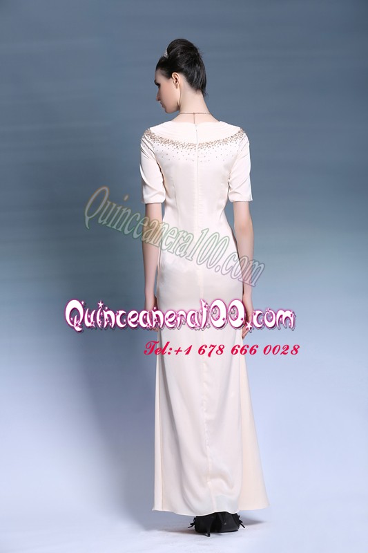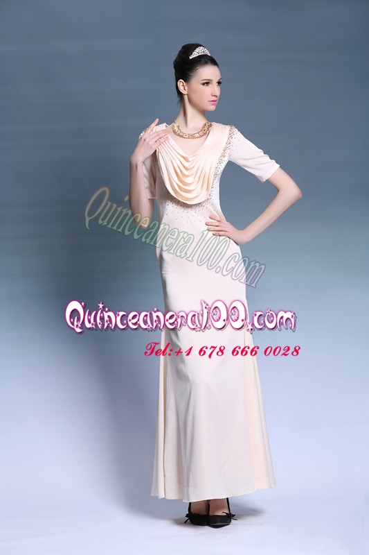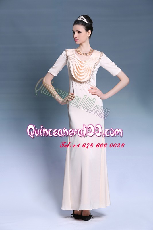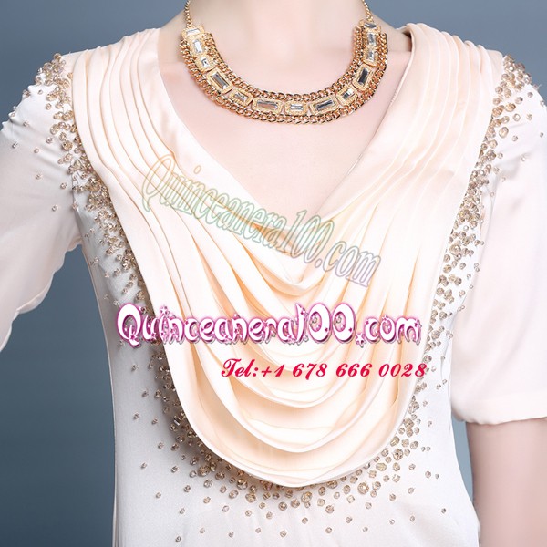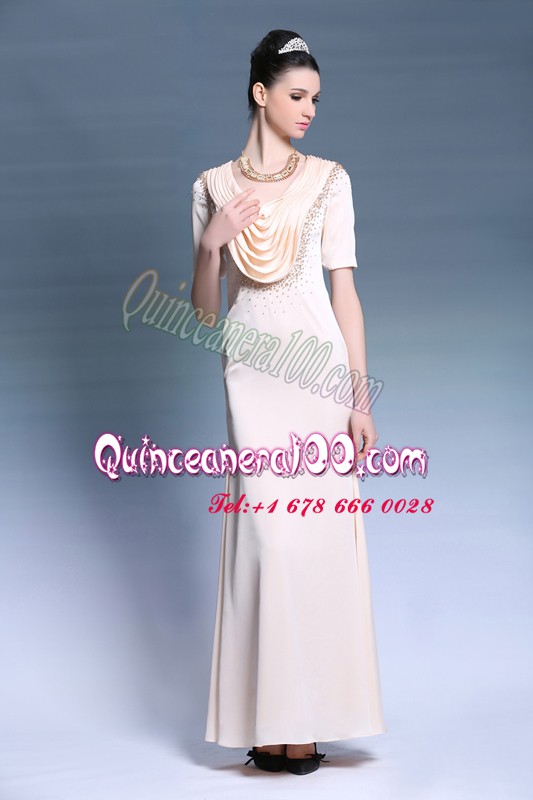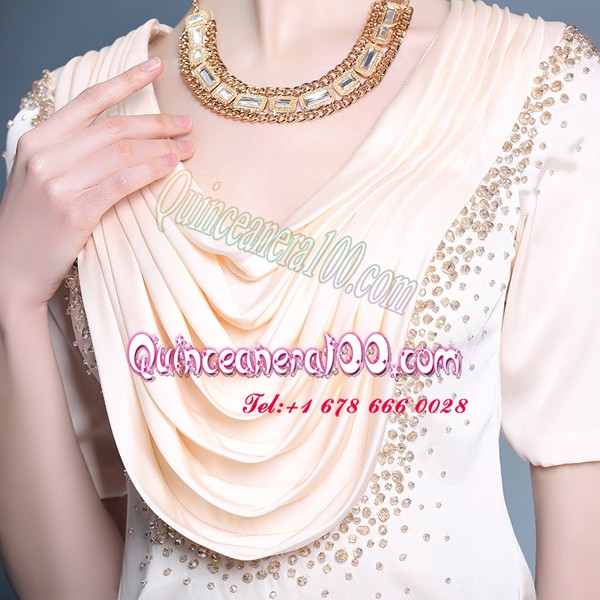 Neckline : ScoopShown Color : ChampagneSilhouette : EmpireSleeve Length : short sleevesHemline : floor lengthBack Detail : ZipperFabric : ChiffonEmbellishment : Beading,RuchingOccasion : Prom,PartySeason : Spring,Summer,Fall,Winter