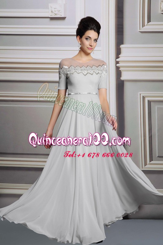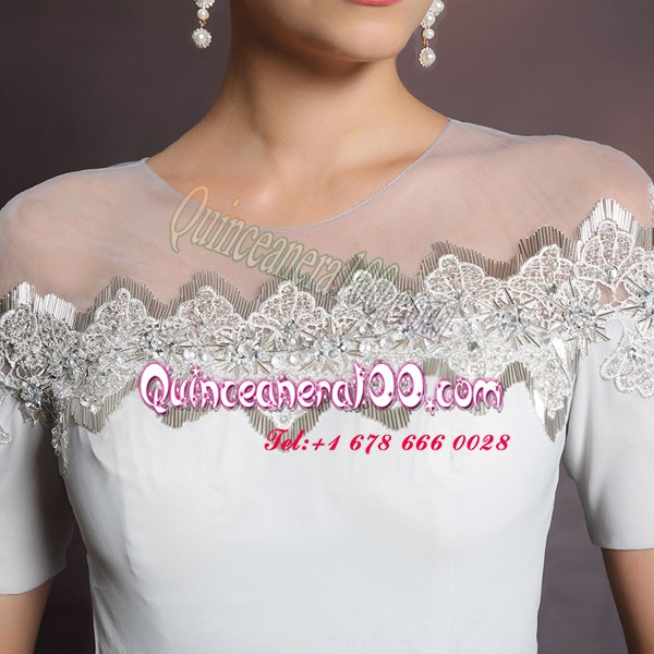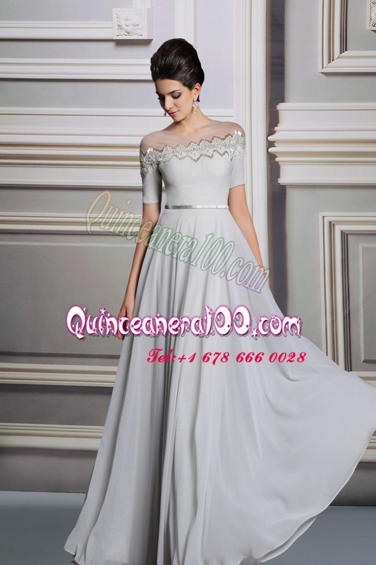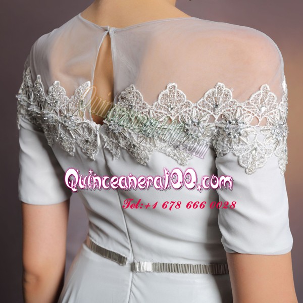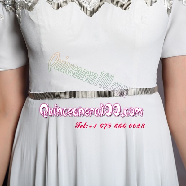 Neckline : ScoopShown Color : SilverSilhouette : EmpireSleeve Length : short sleevesHemline : floor lengthBack Detail : ZipperFabric : SatinEmbellishment : Appliques,BeltOccasion : Prom,PartySeason : Spring,Summer,Fall,Winter