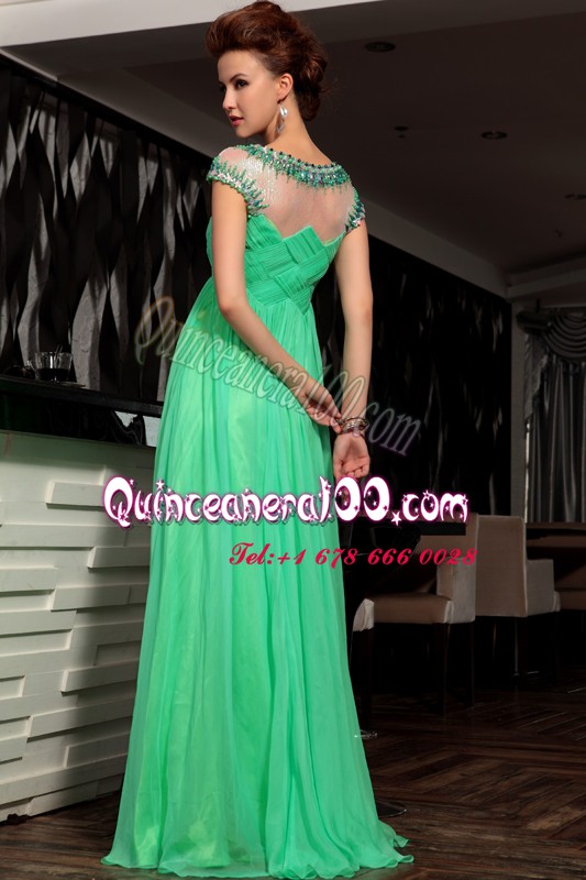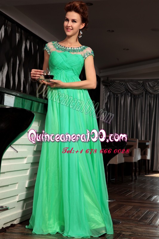 Neckline : ScoopShown Color : GreenSilhouette : EmpireSleeve Length : sleevelessHemline : floor lengthBack Detail : Side zipperFabric : ChiffonEmbellishment : Beading,RuchingOccasion : Prom,PartySeason : Spring,Summer,Fall,Winter