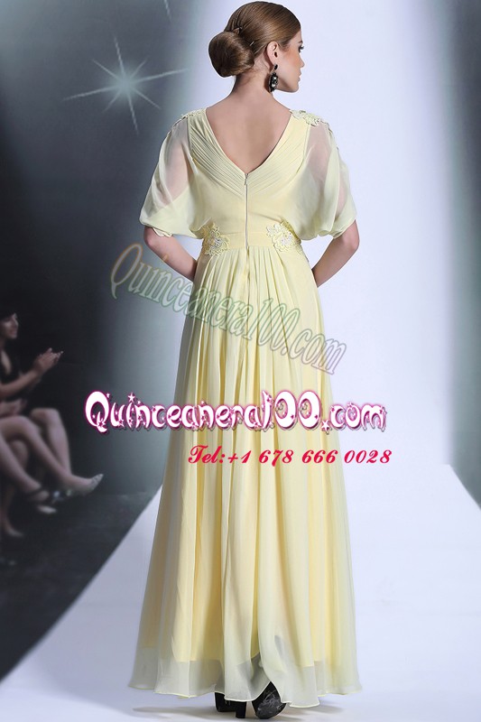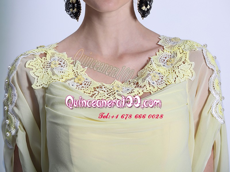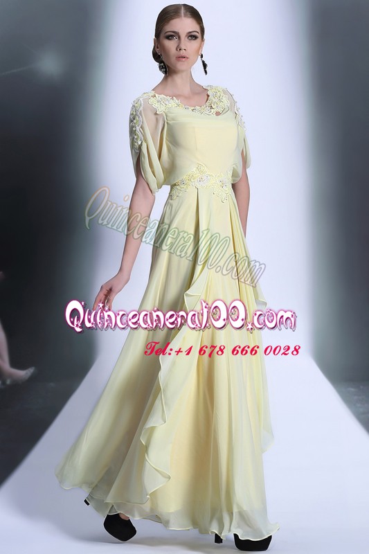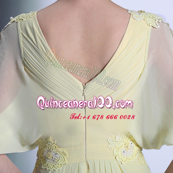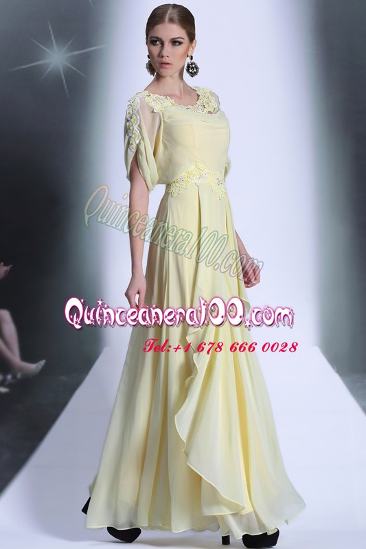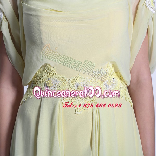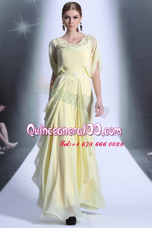 Neckline : ScoopShown Color : Light YellowSilhouette : EmpireSleeve Length : short sleevesHemline : floor lengthBack Detail : ZipperFabric : OrganzaEmbellishment : Lace,RufflesOccasion : Prom,PartySeason : Spring,Summer,Fall,Winter