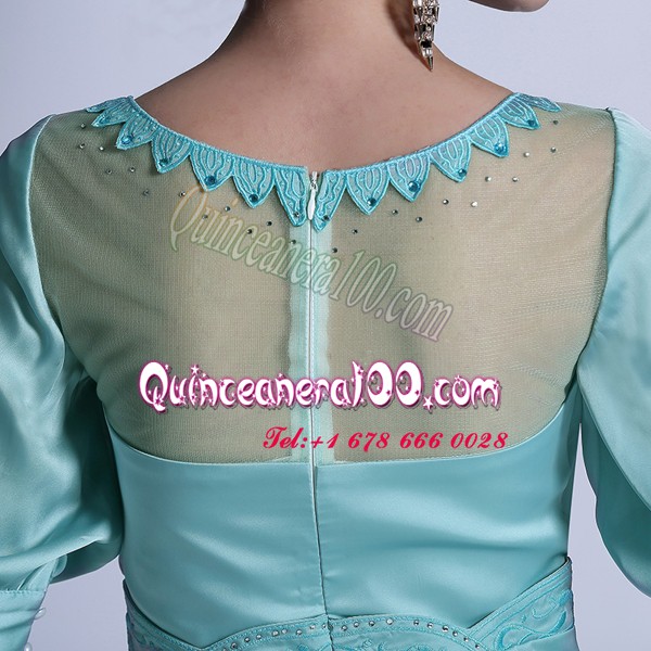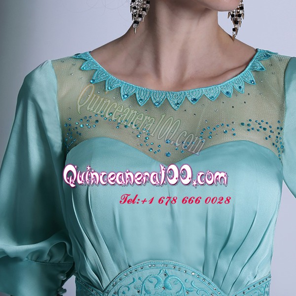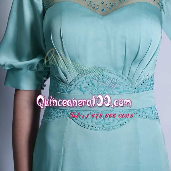 Neckline : BateauShown Color : Aqua BlueSilhouette : Column/SheathSleeve Length : half sleevesHemline : floor lengthBack Detail : ZipperFabric : ChiffonEmbellishment : Sequins,PleatedOccasion : Prom,PartySeason : Spring,Summer,Fall,Winter