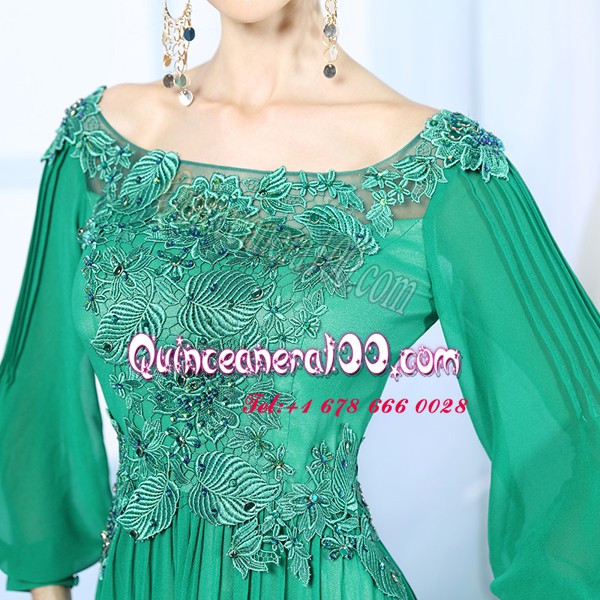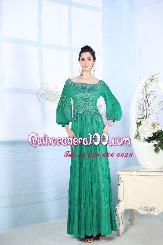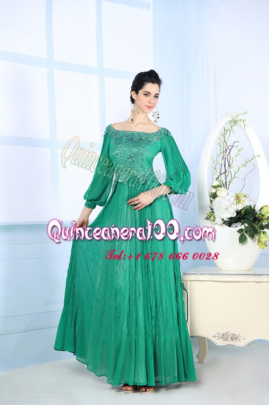Neckline : SquareShown Color : GreenSilhouette : Column/SheathSleeve Length : 3|4 length sleeveHemline : floor lengthBack Detail : ZipperFabric : ChiffonEmbellishment : Beading,Appliques,RuchingOccasion : Prom,PartySeason : Spring,Summer,Fall,Winter