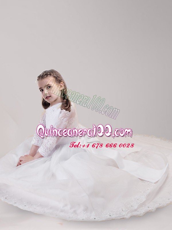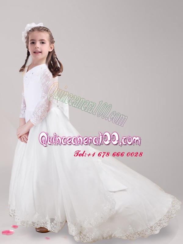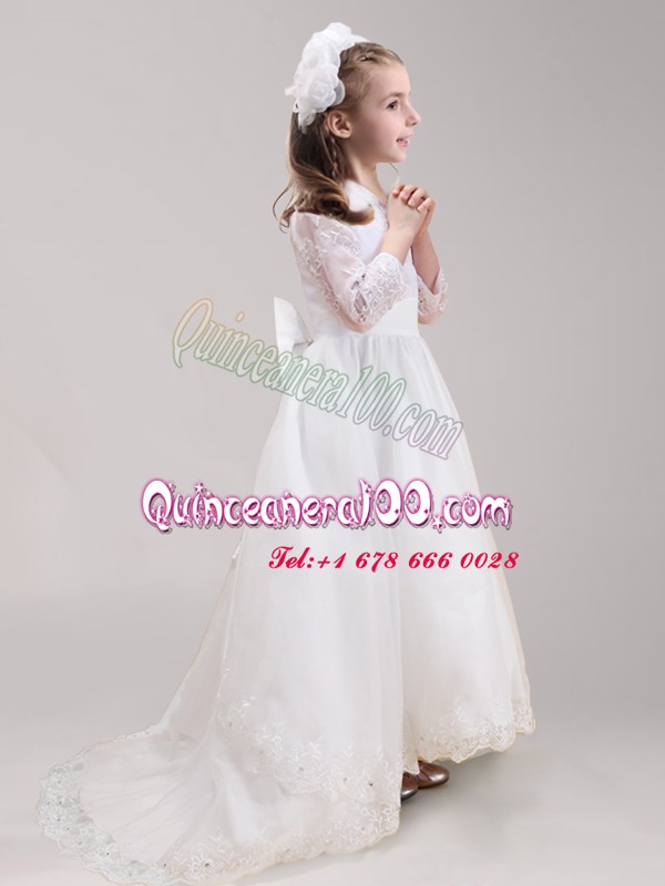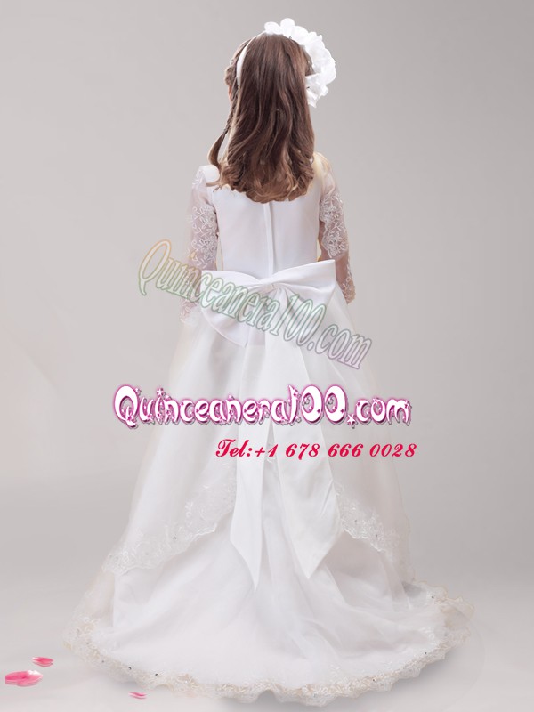 Neckline : ScoopShown Color : WhiteSilhouette : EmpireSleeve Length : long sleevesHemline : with trainBack Detail : ZipperFabric : TulleEmbellishment : Lace,BowknotOccasion : Quinceanera,Wedding PartySeason : Spring,Summer,Fall,Winter