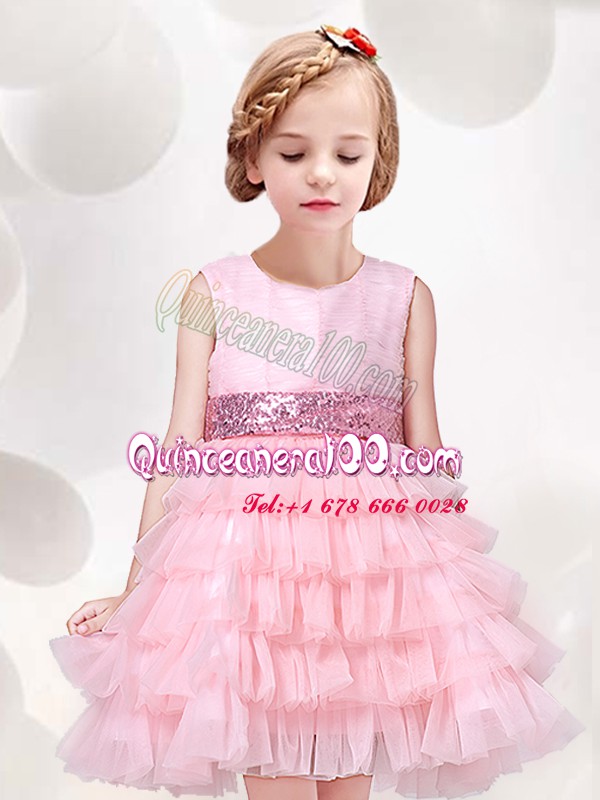 Neckline : ScoopShown Color : Baby PinkSilhouette : A-lineSleeve Length : sleevelessHemline : mini lengthBack Detail : ZipperFabric : TulleEmbellishment : Ruffled Layers,Sequins,BowknotOccasion : Party,Quinceanera,Wedding PartySeason : Spring,Summer,Fall