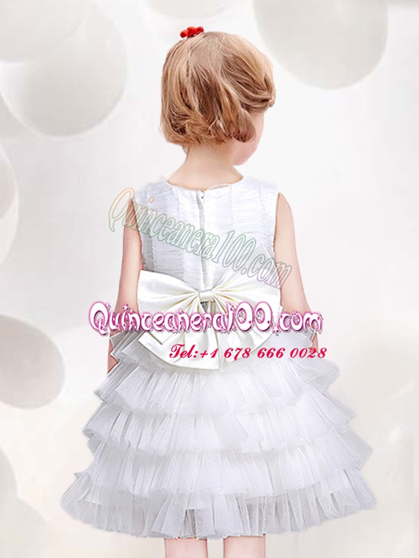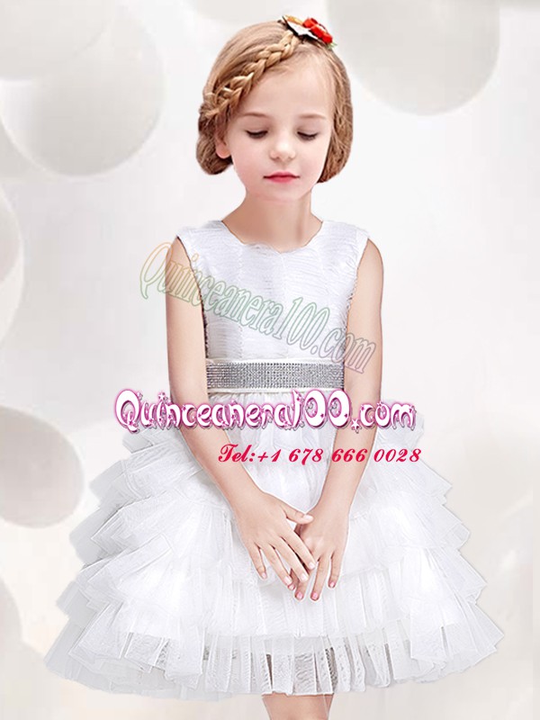 Neckline : ScoopShown Color : WhiteSilhouette : A-lineSleeve Length : sleevelessHemline : mini lengthBack Detail : ZipperFabric : TulleEmbellishment : Ruffled Layers,Sequins,BowknotOccasion : Party,Quinceanera,Wedding PartySeason : Spring,Summer,Fall