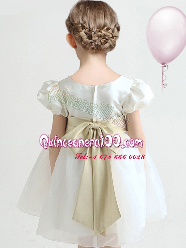 Neckline : ScoopShown Color : WhiteSilhouette : EmpireSleeve Length : short sleevesHemline : knee lengthBack Detail : ZipperFabric : OrganzaEmbellishment : BowknotOccasion : Party,Quinceanera,Wedding PartySeason : Spring,Summer,Fall