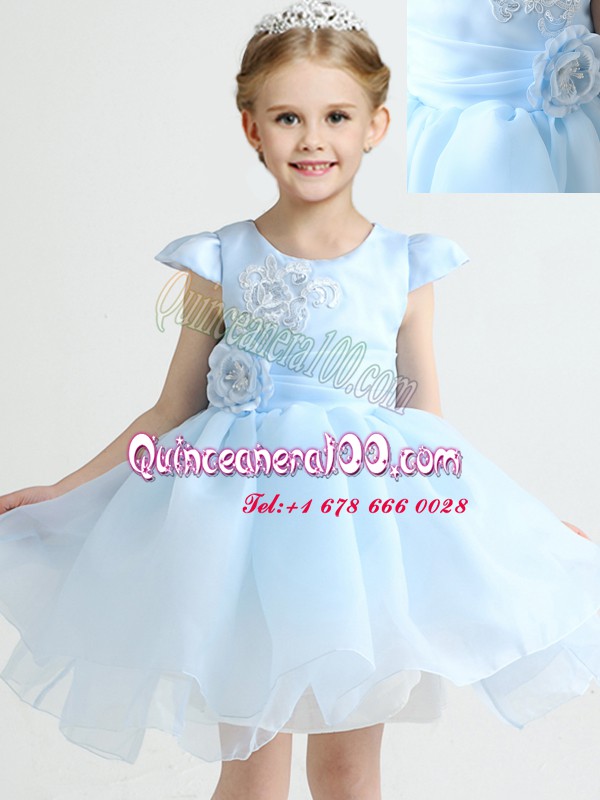 Scoop Light Blue Cap Sleeves Appliques and Bowknot and Hand Made Flower Mini Length Flower Girl Dresses