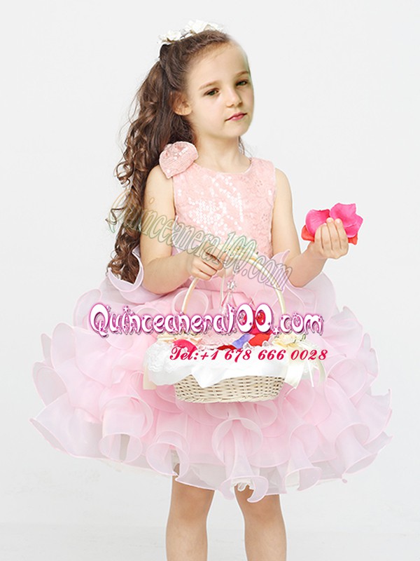 Neckline : ScoopShown Color : PinkSilhouette : Ball GownsSleeve Length : sleevelessHemline : mini lengthBack Detail : ZipperFabric : OrganzaEmbellishment : Lace,RufflesOccasion : Party,Quinceanera,Wedding PartySeason : Spring,Summer,Fall