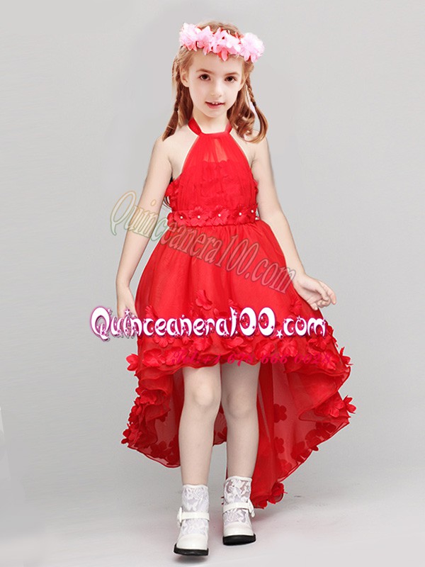 Neckline : Halter topShown Color : RedSilhouette : A-lineSleeve Length : sleevelessHemline : high lowBack Detail : ZipperFabric : OrganzaEmbellishment : Appliques,BowknotOccasion : Party,Quinceanera,Wedding PartySeason : Spring,Summer,Fall