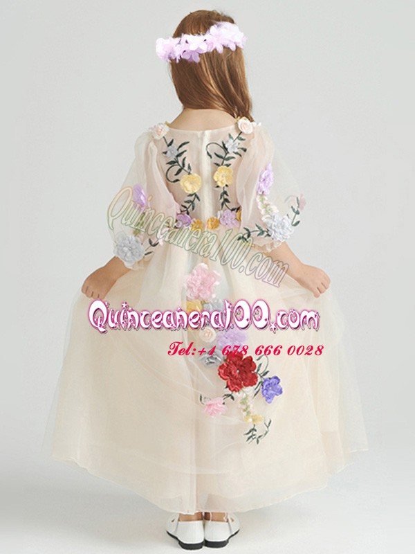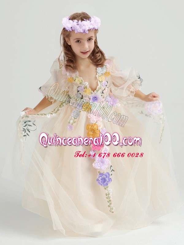 Neckline : V-neckShown Color : ChampagneSilhouette : EmpireSleeve Length : half sleevesHemline : ankle lengthBack Detail : ZipperFabric : TulleEmbellishment : Appliques,Hand Made FlowerOccasion : Party,Quinceanera,Wedding PartySeason : Spring,Summer,Fall,Winter