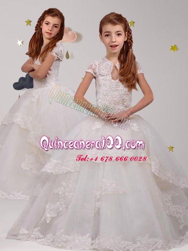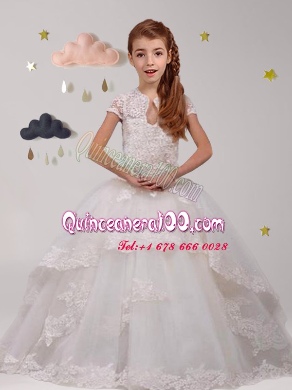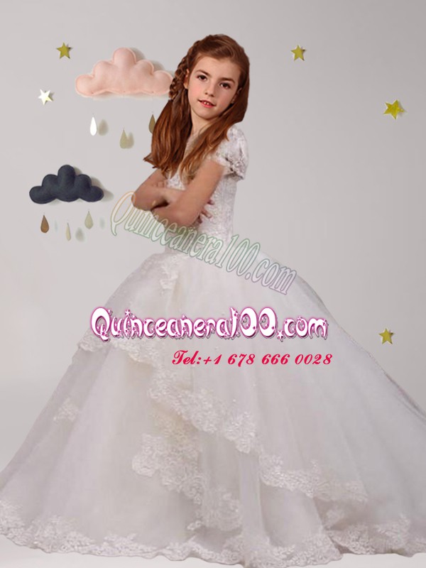 Neckline : ScoopShown Color : WhiteSilhouette : Ball GownsSleeve Length : short sleevesHemline : with trainBack Detail : BacklessFabric : TulleEmbellishment : LaceOccasion : Party,Quinceanera,Wedding PartySeason : Spring,Summer,Fall,Winter