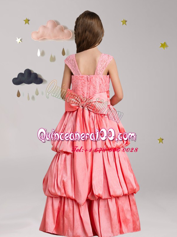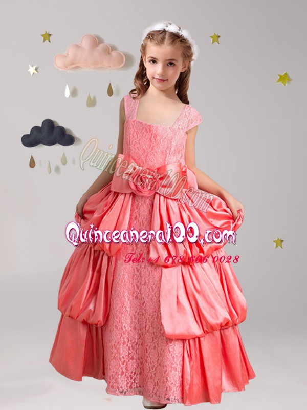 Neckline : StrapsShown Color : Watermelon RedSilhouette : A-lineSleeve Length : cap sleevesHemline : floor lengthBack Detail : ZipperFabric : Taffeta,LaceEmbellishment : Pick Ups,Bowknot,Hand Made FlowerOccasion : Quinceanera,Wedding PartySeason : Spring,Summer,Fall,Winter