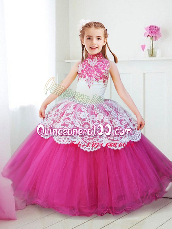 Neckline : High-neckShown Color : Hot PinkSilhouette : Ball GownsSleeve Length : sleevelessHemline : floor lengthBack Detail : ZipperFabric : TulleEmbellishment : Beading,LaceOccasion : Party,Quinceanera,Wedding PartySeason : Spring,Summer,Fall,Winter