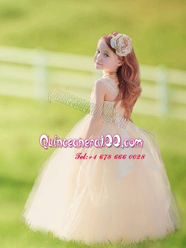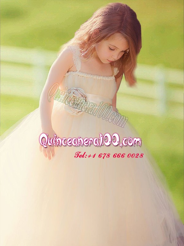 Neckline : StrapsShown Color : ChampagneSilhouette : A-lineSleeve Length : sleevelessHemline : floor lengthBack Detail : ZipperFabric : TulleEmbellishment : Bowknot,Hand Made FlowerOccasion : Party,Quinceanera,Wedding PartySeason : Summer,Fall,Winter