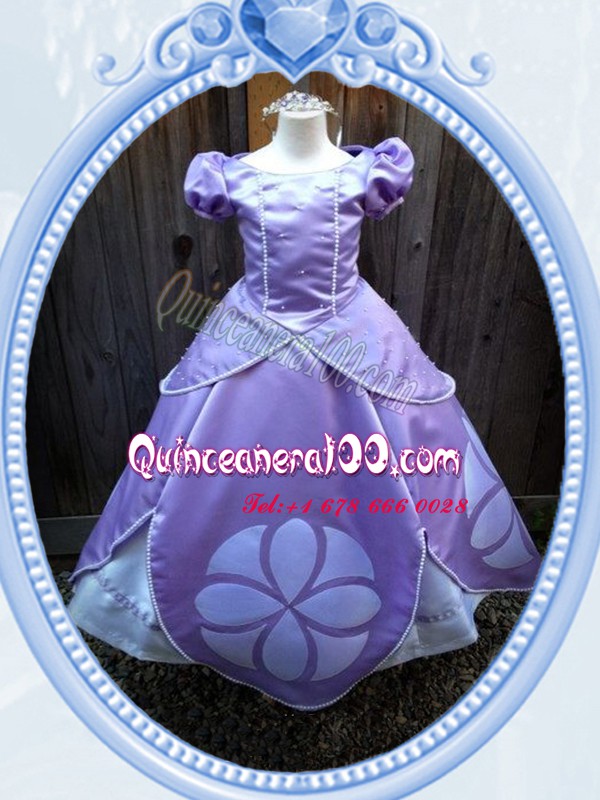 Neckline : ScoopShown Color : LavenderSilhouette : Ball GownsSleeve Length : short sleevesHemline : floor lengthBack Detail : ZipperFabric : SatinEmbellishment : BeadingOccasion : Quinceanera,Wedding PartySeason : Spring,Summer,Fall,Winter