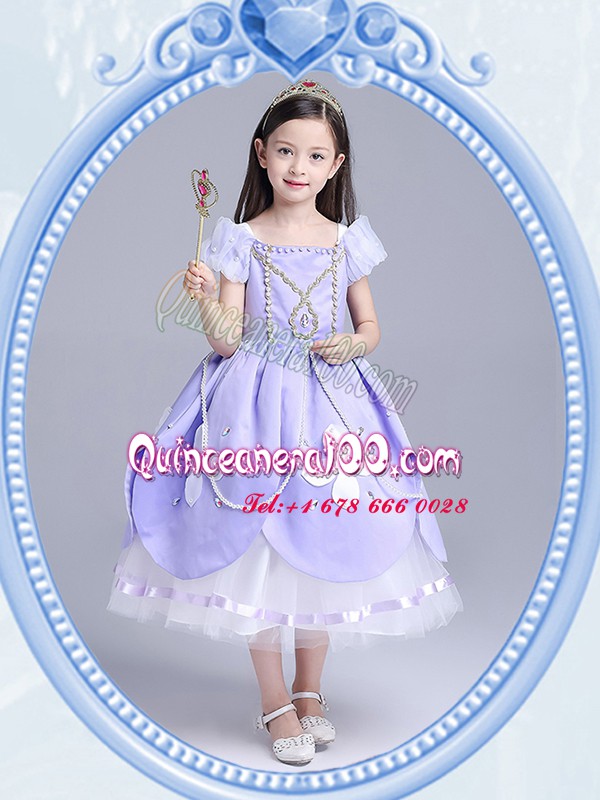 Neckline : SquareShown Color : LavenderSilhouette : Ball GownsSleeve Length : short sleevesHemline : tea lengthBack Detail : ZipperFabric : Taffeta,TulleEmbellishment : Beading,AppliquesOccasion : Party,Quinceanera,Wedding PartySeason : Spring,Summer,Fall