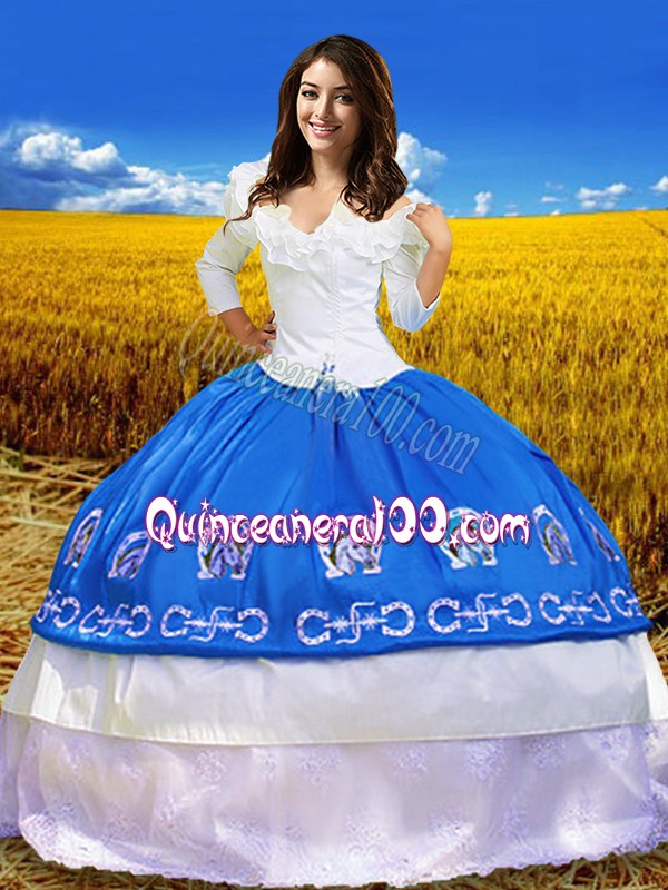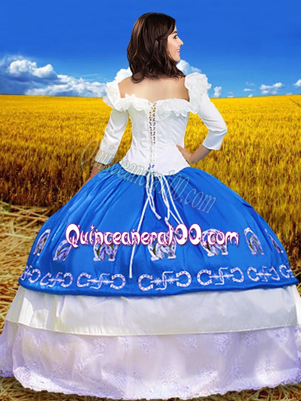 Neckline : Off the shoulderShown Color : BlueSilhouette : Ball GownsSleeve Length : 3|4 length sleeveHemline : floor lengthBack Detail : Lace upFabric : TaffetaEmbellishment : EmbroideryOccasion : Military Ball,Sweet 16,QuinceaneraSeason : Spring,Summer,Fall,Winter