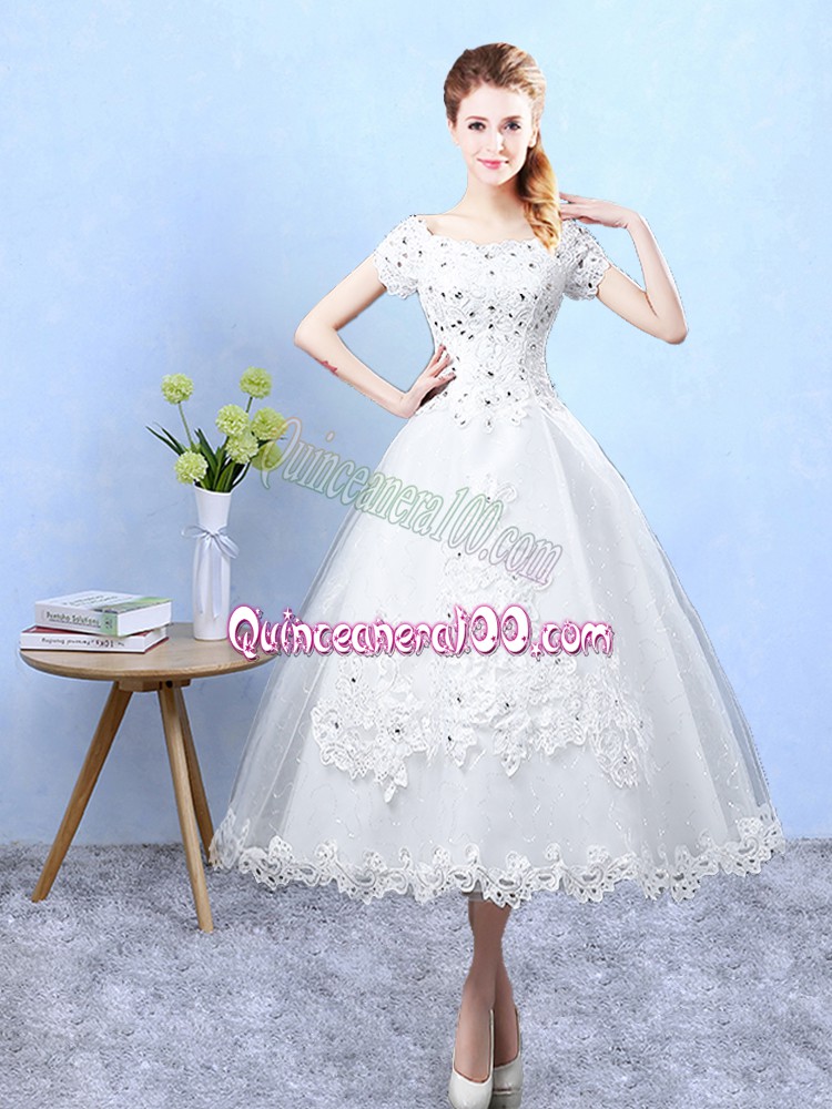 Neckline : ScoopShown Color : WhiteSilhouette : A-lineSleeve Length : short sleevesHemline : ankle lengthBack Detail : Lace upFabric : TulleEmbellishment : Beading,Lace,BowknotOccasion : Prom,Party,Wedding PartySeason : Spring,Summer,Fall,Winter