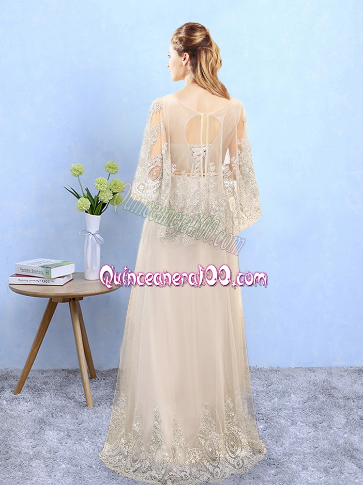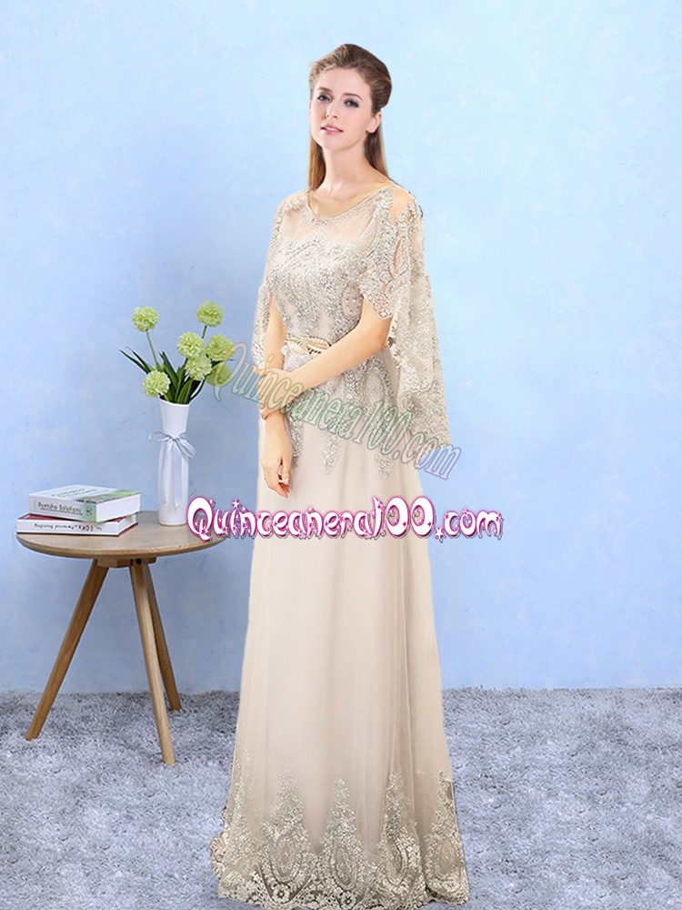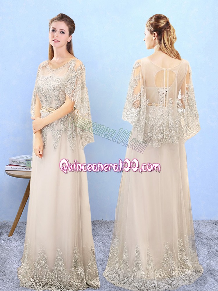 Neckline : ScoopShown Color : ChampagneSilhouette : EmpireSleeve Length : half sleevesHemline : floor lengthBack Detail : Lace upFabric : TulleEmbellishment : Beading,AppliquesSeason : Spring,Summer,Fall,Winter
