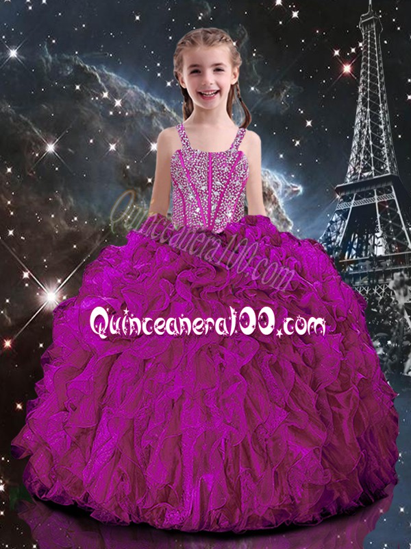 Neckline : StrapsShown Color : FuchsiaSilhouette : Ball GownsSleeve Length : short sleevesHemline : floor lengthBack Detail : Lace upFabric : OrganzaEmbellishment : Beading,RufflesOccasion : Quinceanera,Wedding PartySeason : Spring,Summer,Fall,Winter
